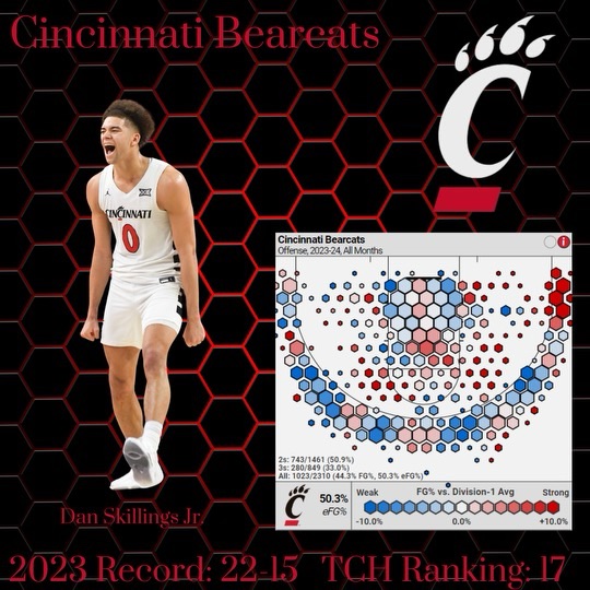 Boy, do I adore this team. This team won 22 games last season and is returning nearly 63% of their minutes from last year. And, despite losing 15 games last year, 10 of those games were by less than 5 points. This Cincinnati team is tough. And clearly the analytics agree. In KenPom, the Bearcats are ranked 17th. In BartTorvik, they’re 27th. The AP Poll also has them 20th. Despite the rigorous Big 12 schedule, Cincinnati fared well in their first season in the conference, going 7-11 in Big 12 play. If you told Coach Wes Miller two years ago that the general consensus would be THIS high on the Bearcats, he probably wouldn’t be surprised. Miller is 248-178 as a coach in his career and none of his teams have had a losing record since 2015-16. In fact, seven of the past eight years, his teams have won 20+ games.