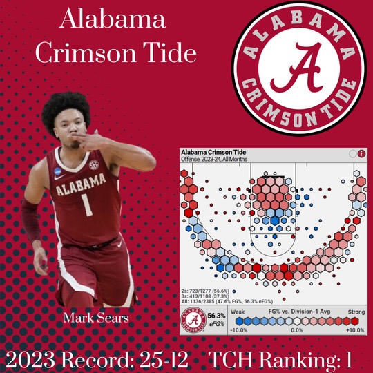 Now onto the Alabama Crimson Tide…My pick to win the 2025 NCAA tournament. Nate Oats is 8-4 in the NCAA tournament as the head coach of the Crimson Tide, and after making the Final Four last season, Oats seems poised to return to the Final Four with an improved and more seasoned Bama squad. The 2024-2025 Tide are the deepest basketball roster that Tuscaloosa has ever called their own, and should be the team that takes them to the steepest heights they have ever known…Below are the crew’s rankings for the Crimson Tide heading into tip-off!