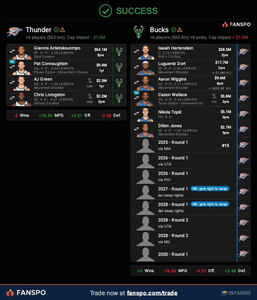 In my opinion, after winning 68 games this year and having a whole flurry of assets in terms of draft equity, there’s no better time than now for OKC to push their chips in. Stars of Giannis’ caliber don’t become available often, and OKC’s draft pick equity and amount of young players on reasonable, team-friendly contracts make this a match made in heaven. OKC has an embarrassment of riches, and if Milwaukee wants a pick-heavy package, nobody will be able to outbid OKC. In this scenario, Milwaukee gets pick #15 in this upcoming draft plus a slew of draft capital throughout the next four drafts plus a 2030 first far enough out into the future that if you squint, could be valuable.
