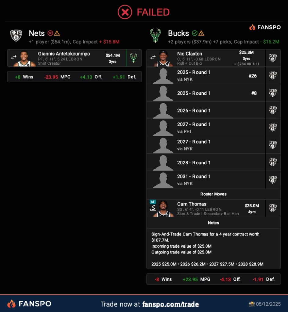 Where there’s smoke, there’s fire. And there’s long been speculation this season about Giannis potentially headed to the Nets. Given that Brooklyn only has four guaranteed contracts on their roster heading into the offseason, this package would need to be heavily pick incentivized. For what it’s worth, going into the offseason, Brooklyn has about $62 million in cap space with Cam Thomas’ cap hold on the books. In this scenario, Milwaukee gets Cam Thomas in a sign-and-trade for 4/$107 million. Is Thomas worth that contract? That’s to be seen. Milwaukee would need to buy into the elite scoring ability and Claxton’s versatile defensive ability to make this deal worthwhile. For what it’s worth, Milwaukee can add salary to this deal by being able to move off of potential players like Pat Connaughton and Bobby Portis to further their financial flexibility. Claxton would essentially be the Bucks’ Brook Lopez replacement, as Lopez is entering unrestricted free agency.
