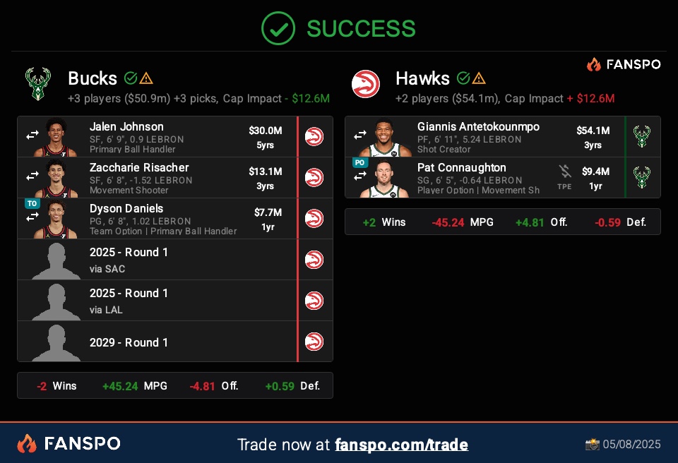 However, if Atlanta trades all those assets for Giannis, the cupboards become pretty bare between Trae Young and Giannis. The only potential starting caliber players left on Atlanta’s roster would be Onyeka Okongwu and Terance Mann, while Georges Niang remains a rotation player. This would be one of those scenarios where the Hawks would need to hope that high level role players would play at a discount in order for a chance to play with Trae Young and Giannis to fill out the rest of the roster. While the Hawks may not become an instant contender with this deal, this type of package would be STRONG in the Giannis sweepstakes.